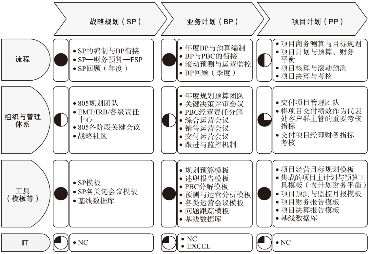 SP、BP、PP都包含“计划—预算—核算”的闭环管理,从而形成PDCA的管理运作过程。这三个关键业务环节的流程、组织与管理体系、工具及IT支撑的详细内容如图3-2所示。