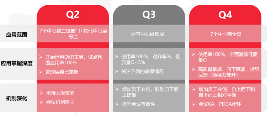 Q2的应用范围是7个中心到二级部门和其他中心层总监,到了Q3,履盖到所有中心经理层,Q4要求从7个中心到全员,都运用OKR工具,而且要求全面消除低质量的“O”。变革机制上,也由自上而下,到自下而上,再到员工共创,形成PDCA闭环。