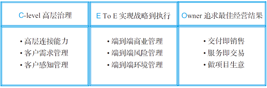 其中“C”代表C-level govermance,即客户(干系人)高层治理;“E”代表End to endmanagement,即端到端实现战略到执行;“O”代表着Owner of business,意味着对公司的经营成果承担责任,并追求最理想的经营成果。