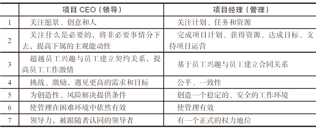项目CEO在项目管理中处于核心地位,它和一般意义上项目经理有一个显著不同:项目CEO不只是一个协调员或者执行指挥员,还要有责任心和使命感,承担起对外代表企业、对内代表客户的价值创造的责任,要“想老板那样”,只有这样,项目CEO才有可能围绕整个项目目标掌握整个项目风险并给顾客,华为等干系人带来价值。项目CEO与项目经理的区别如表3-1所示。