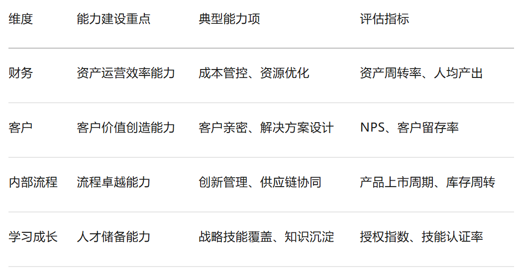 基于澄清的战略,需要区分“维持性能力”与“突破性能力”。建议采用BSC平衡计分卡四维度拆解,建立能力建设优先级矩阵:
