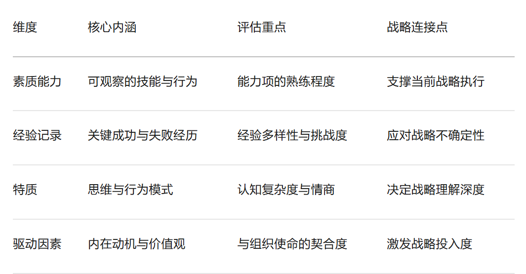 这一框架不仅关注现有的能力表现,更强调领导力潜质——即那些“关注长期未来、尚未展现、难以观察”的能力要素,为组织储备面向未来的能力底座。