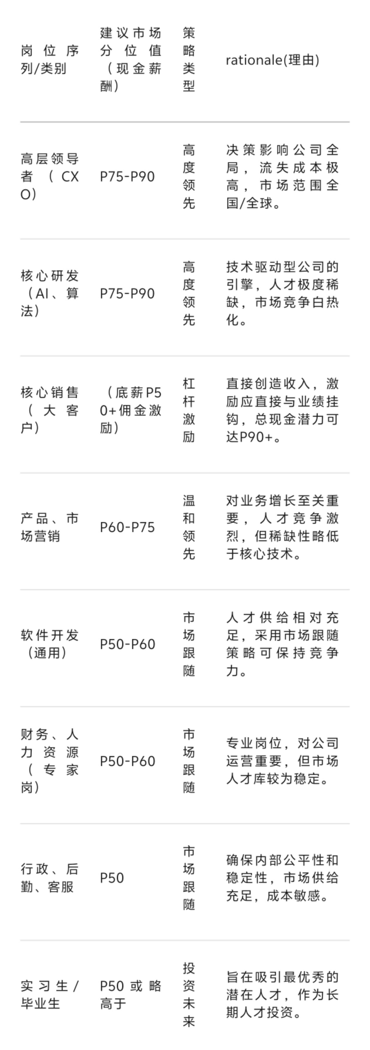 跟随型策略(P50左右):传达“我们提供稳定且具市场公平性的报酬”的信号,它能保持一定的竞争力,同时控制成本是大多数成熟企业的选择。