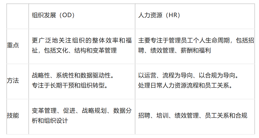 OD需要变革管理、促进、战略规划、数据分析和组织设计方面的专业知识,人力资源依赖于招聘、培训、绩效管理、员工关系和合规方面的技能。
