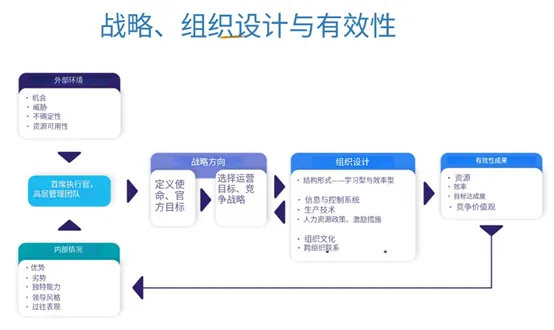 先从定义开始:组织设计是组织战略计划的管理和执行,意味着组织的战略决定了最优的组织设计。组织设计就是在组织的战略选择与组织环境之间创造最佳匹配,组织设计由公司的战略方向决定,即公司的愿景、使命和目标,这些策略引领公司制定出竞争的策略,而这些策略通过组织设计得以实现。