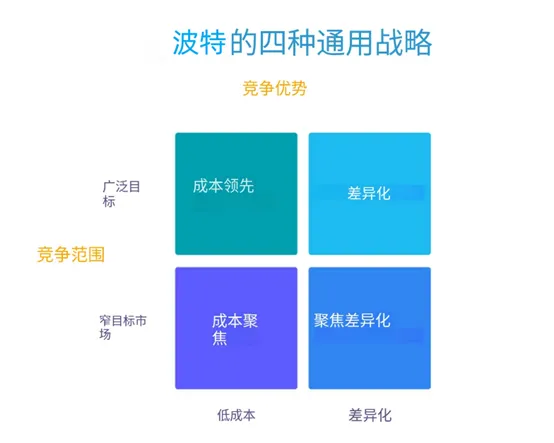 组织战略是组织结构和设计最重要的起点。迈克尔·E·波特提出,组织可以通过降低成本或提供具有特色且价格优异的产品和服务来竞争。第二步是确定组织的范围是狭窄还是广泛,意味着组织要么在多个客户细分领域竞争,要么在特定客户细分领域竞争。这促成了波特的竞争战略框架,其中确定了四种竞争策略:成本领导、成本聚焦、差异化和聚焦差异化。
