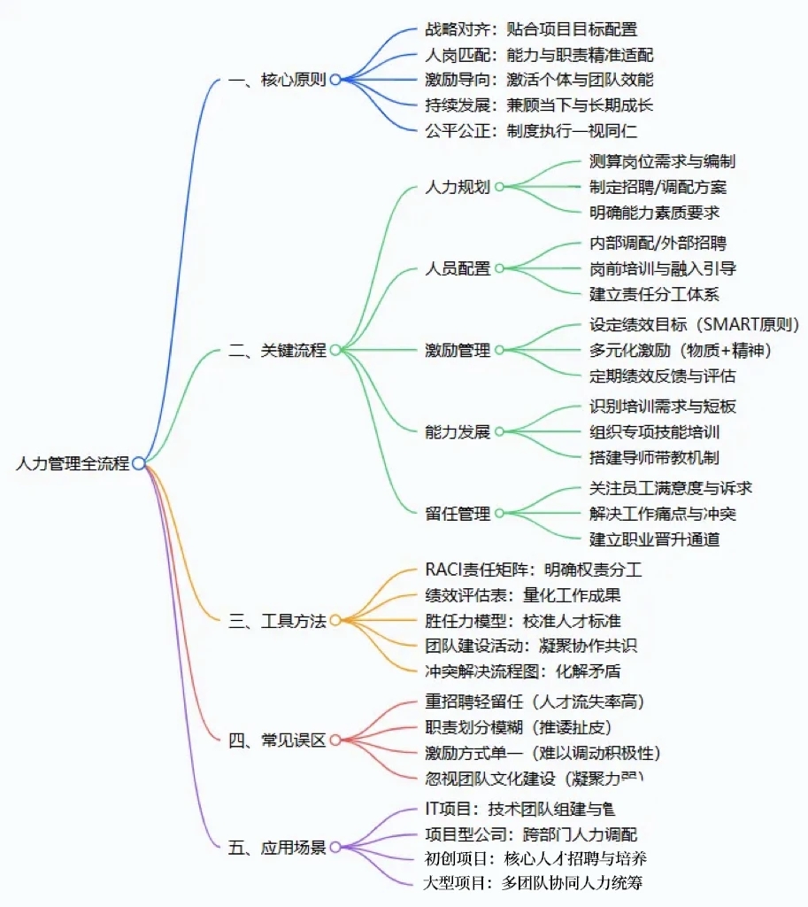 在企业管理的棋盘上,人力资源从来不是 “后勤配角”,而是决定胜负的 “核心棋手”。从初创公司的人才搭建,到大型项目的团队协同,一套科学的人力管理体系,既能让个体效能最大化,也能让组织能力持续生长。今天,我们就从一张思维导图出发,拆解人力管理的底层逻辑,用真实案例让理论落地。